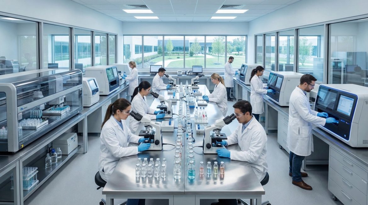 [IMAGE: Nowoczesne laboratorium medyczne z zaawansowanym sprzętem do produkcji preparatów estetycznych, naukowcy w białych fartuchach analizujący próbki]